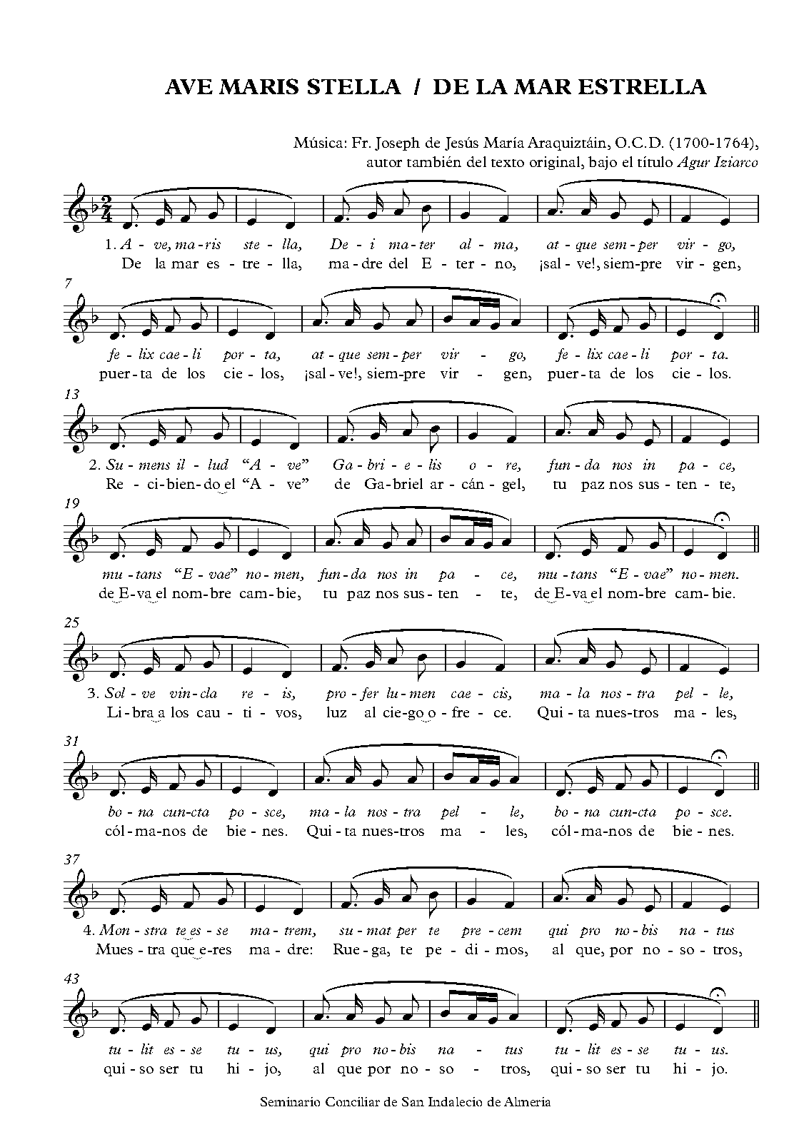 | Extra Information | Original Basque lyrics of this work were also written by Araquiztáin (first words: Agur Iziarco). This version contains the Latin hymn Ave maris stella as lyrics (as it is frequently performed), and an anonymous translation into Spanish, as well. |