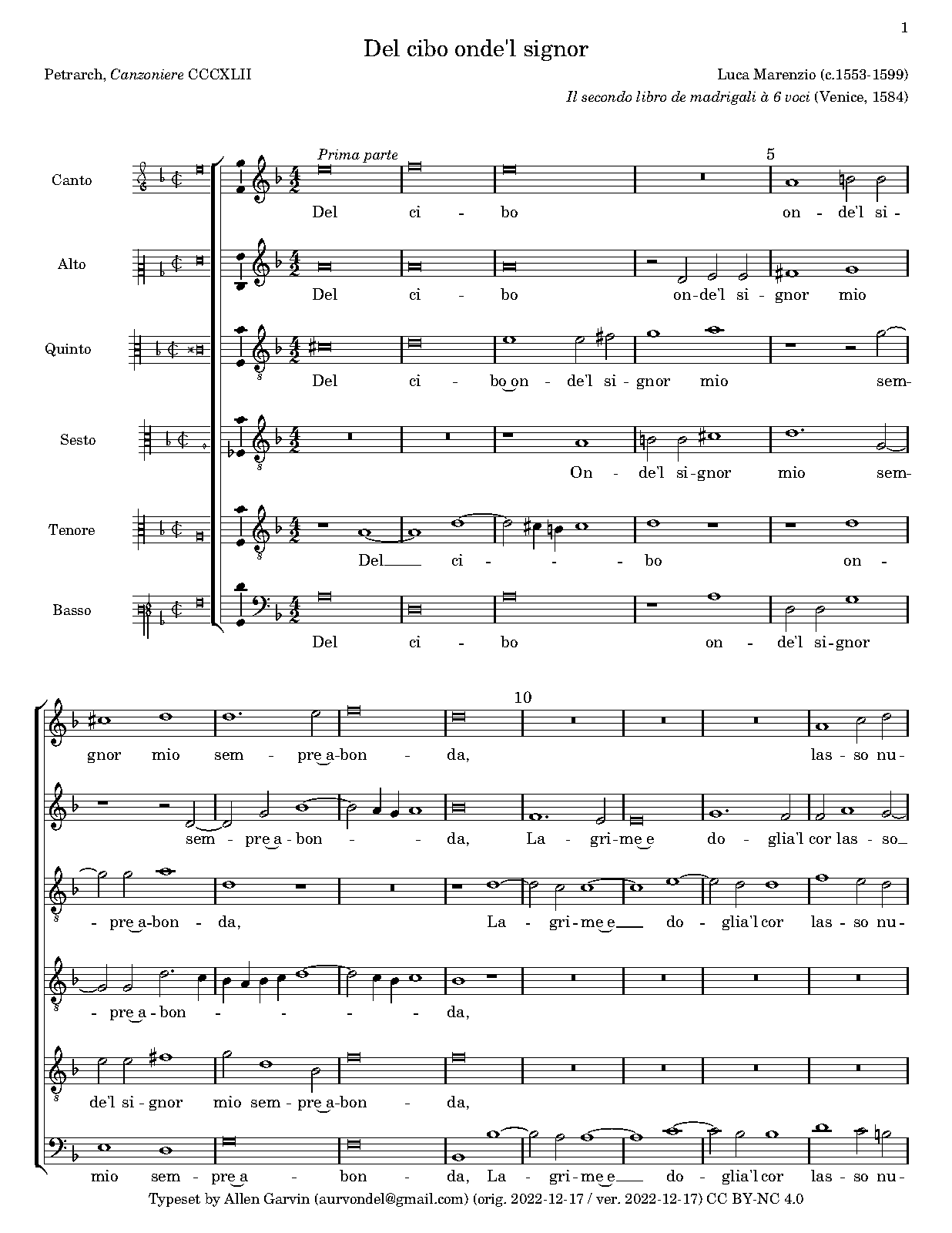 | First Publication | 1584 in Il secondo libro de madrigali à 6 voci (Venice: Angelo Gardano press) |