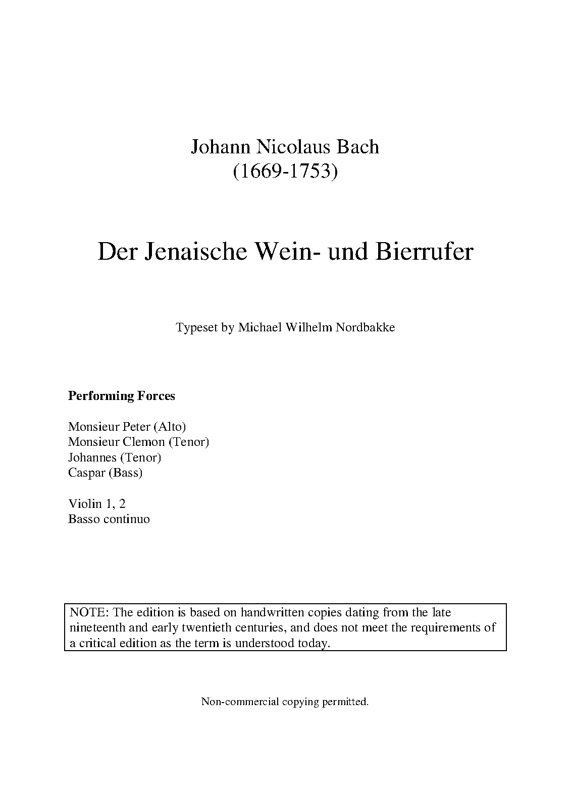 A scenic cantata about student life. Peter and Clemon, two freshmen, arrive in Jena. They attempt to ask for lodging at Caspar's inn, but end up mocking and insulting Johannes, the "wine and beer crier."