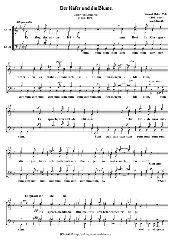 "Preislieder (3) gekrönt im Compositions-Kampfe am 1. August 1852 zu Düsseldorf. Bönicke, H., Im Weinhaus. Faist, J., Lebewohl. Veit, W.H., Käfer und Blume, f. 4 Männerst." (Monatsbericht (1853), p.292.)