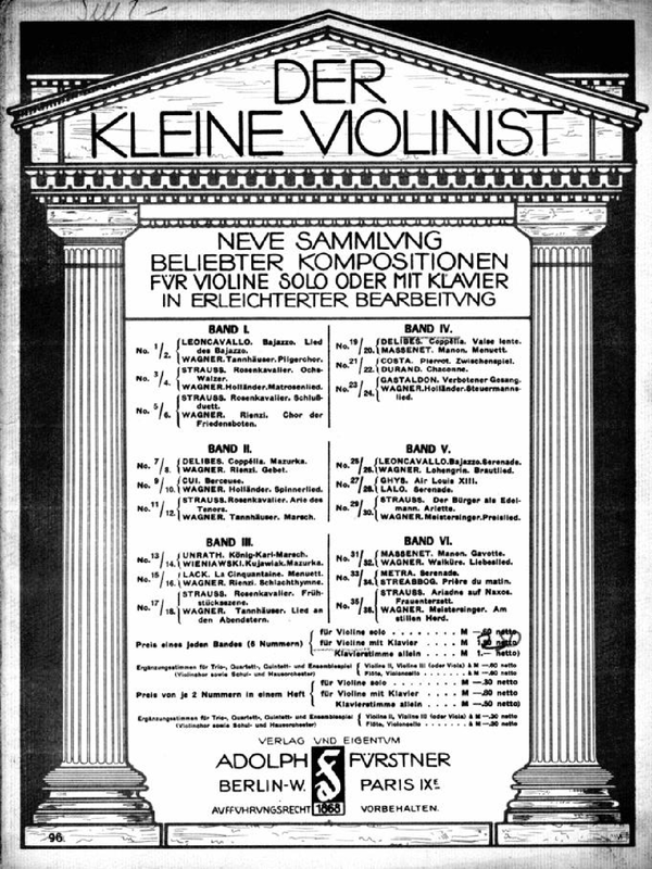 Also published with parts for a second violin, a third violin or viola, a cello, and a flute (Der kleine Flötist)