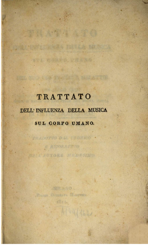 | Alternative. Title | Der musikalische Arzt, oder: Abhandlung von dem Einflusse der Musik auf den Koerper, und von ihrer Anwendung in gewissen Krankheiten. Nebst einigen Winken, zur Anhoerung einer guten Musik; Trattato dell'influenza della musica sul corpo umano e del suo uso in certe malattie con alcuni cenni come si abbia ad intendere una buona musica |