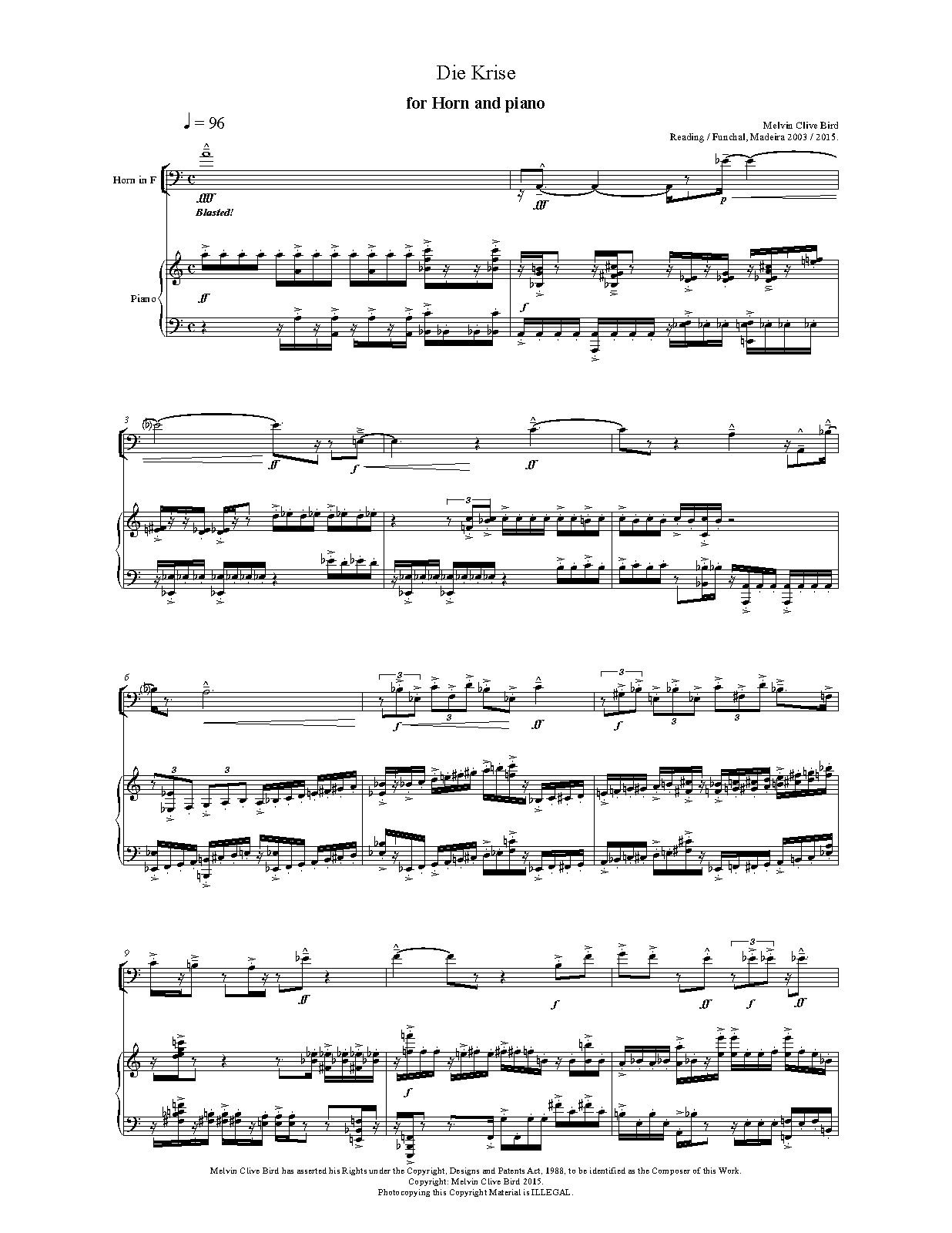Melvin Bird has asserted his right under the Copyright, Designs and Patents Act, 1988, to be identified as the composer of this work. Please contact the composer for further information. The composer welcomes any performances and recordings. melvin.bird@hotmail.com. A clear and clean text. Horn part written at sounding pitch.