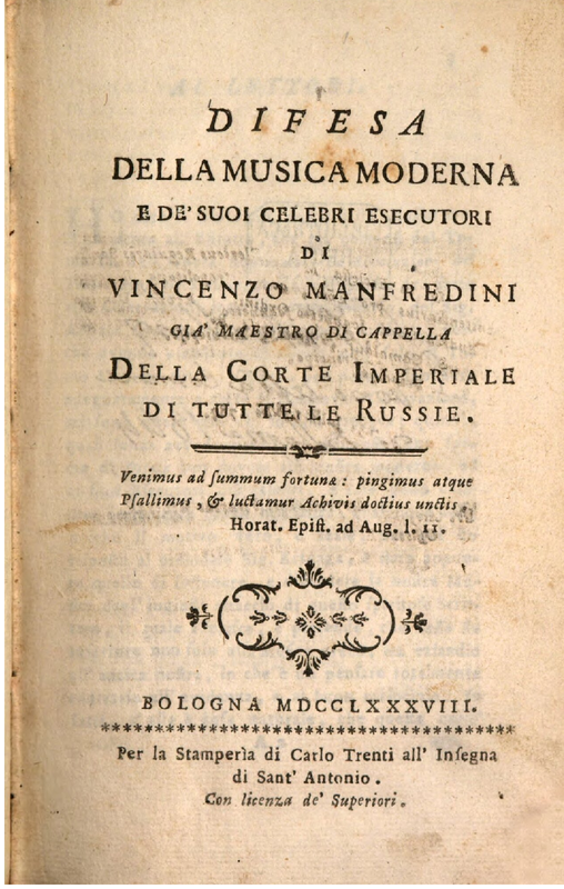 | Alternative. Title | Difesa della musica moderna e de' suoi celebri esecutori |