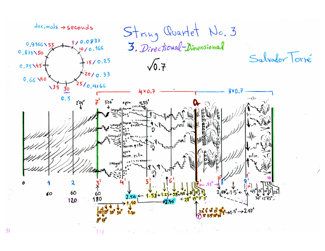 "Directional – Dimensional " : In the String Quartet has been practiced throughout the history of music the aspect of “Laboratory of forms, Methods, Styles, Compositional Substrates etc.” using old methods arises from the canonical imitative forms counterpoint or harmony, all combined with the today languages, the infinity of music we hear today from which, for me the Rock music is very important, as well as electroacoustic practices are evident in this quartet, mixtures and super-positions of elements in a space time either compacted or expanded, micro-imitations are now a days called “delays” or “echoes”. Different distortions caused by the ways of attacking, rub, overpressure, pull hitting different parts of the instrument etc. All this adding an important element today: Improvisation, the interpreter then is enrolled in a state of freedom, but because we are speaking on classical music, this classical style provides the concept of structure, it brings a certain rigorous form. This generates an open-closed form. The title of this piece "Directional-Dimensional" is the juxtaposition of the directionality of lines and internal musical movements, in opposition to “static and contemplatives” (?) sections.