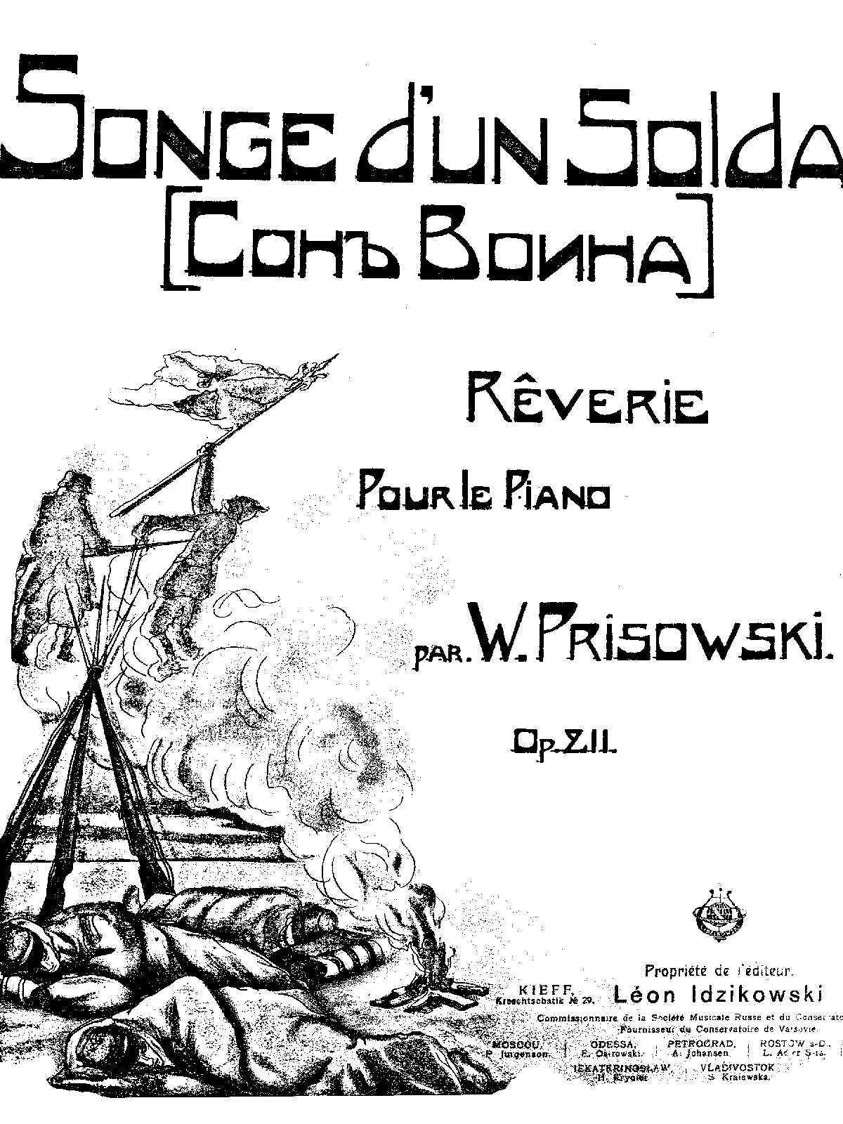 The piece is dedicated to the soldiers: in the summer of the year 1914 Germany declared war on Russia.The picture on the cover depicts the tragic episode of the battle — dreams of warriors, sleeping by the fire. Interestingly, some moments of pieces (measures 11-15) repeat a famous song of Alexander Vertinsky "A Little Creole", dedicated to the famous silent movie actress Vera Kholodnaya. It is obvious that the romance of the famous "Pierrot" was composed later, beginning the year 1917, when Prisovsky's piano piece has already been published and was probably pretty popular. As is often happens in the history, Vertinsky's plagiarism was more viable than the forgotten opus by Prisovsky.
