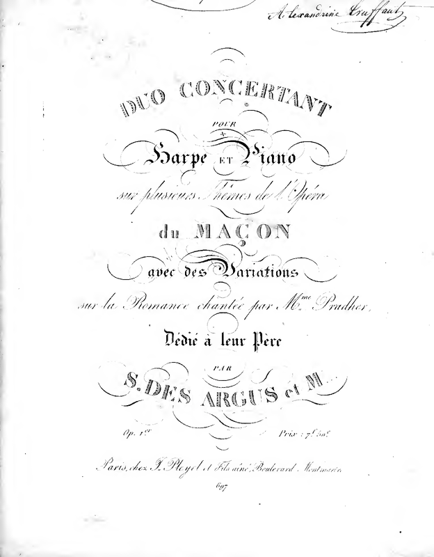 | Work Title | Duo concertant pour harpe et piano sur plusieurs thèmes de l'opéra du Maçon avec des variations sur la romance chantée par Mme. Pradher |