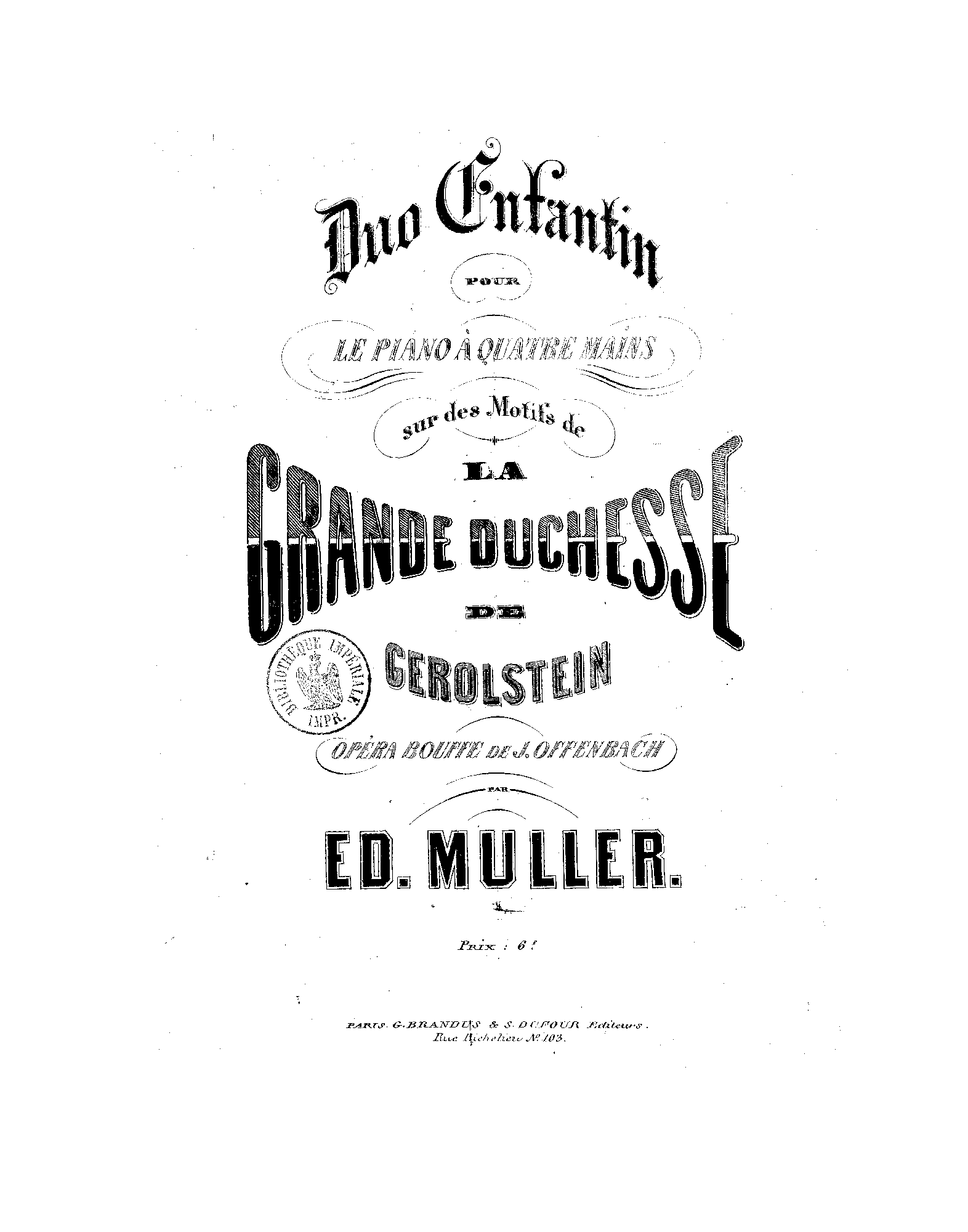 Duo enfantin pour le piano à quatre mains sur des motifs de 'La Grande-Duchesse de Gérolstein'. Opéra-bouffe de J. Offenbach.