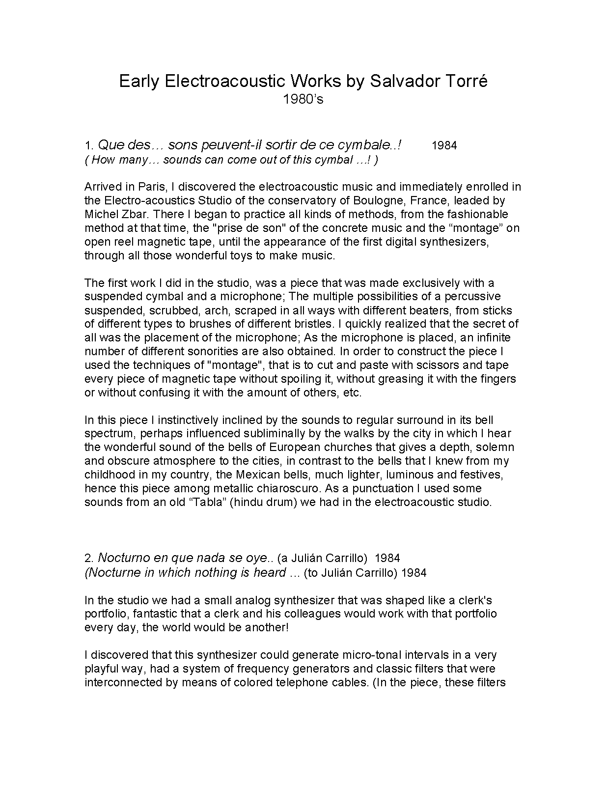 ⇒ 17 more: 2. Nocturno en que nada se oye (a Julián Carrillo)... 1985 • 3. Passages... (1985) • 4. DNA, Cloud of Wings • 5. Stones-Oiseau-Baleine (1989) • 6. Vaisseau I (work in progress) 1989 • 7. Simple Bleu (at Sunset) • 8. Guru (at Night) to Eno • 9. Tiny Forest (Deep of the Night) • 10. Stuppa : Inner Mountain (at Sunrise) • 11. Shômyô (Gratitude Mantram) • 12. Little Glass Horse • 13. Minimal Peace for China (Tiananmen-06/89) • 14. Isa - bella • 15. ACCRO- for sax, analogue synthesis and natural sounds • 16. IMPRO - 1. Coral, for Synthesis FM • 17. IMPRO - 2. Passacaglia of Stars, for Synthesis FM • 18. IMPRO - 3. Twilight March, for synthesis FM