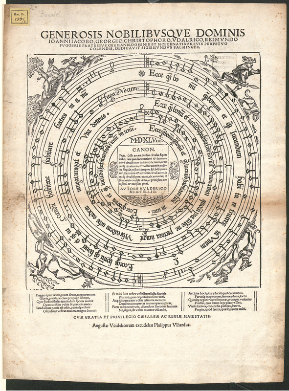 | Extra Information | Canon. Fuga. Octo uocum. Medius circulus fugam habet, cum qua duae exterioris & duae interioris circuli uoces incipiunt, ita tamen, ut ex medij circuli uoce, tres adhuc uoces in unisono singulae post tria tempora sese subsequantur, Exterioris & interioris circuli uoces, in medij circuli fugam cadunt, ubi morantur, et sic in medio consistit uirtus, ac primi fiunt nouissimi, & nouissimi primi. |
