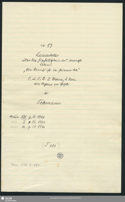 | Alternative. Title | α ÎÉ 57 Lamentatio über die Hinfälligkeit des menschl. Lebens. Ein Mensch ist in seinem Leb. C. A. T. B. 2 Violin, 2 Viole con Organo in triplo di Telemann Dom̅ca XVI p. Tr. 1729 - I p. Tr. 1732 - 16. p. Tr. 1736 T 111 |