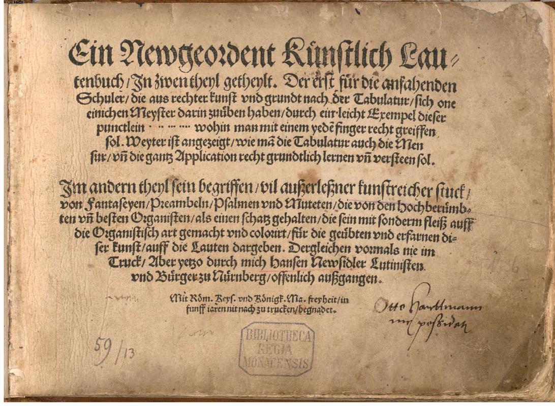 Neusidler's book contains instructions, examples and pieces. The 1st part is oriented nearly to everyone who can read, has at least a small brain and who wants to learn the lute. A teacher is not necessary. ("... das ein yeder gerings verstands/der nur lesen ... kan/... on ein Meister solche kunst der Lauten leren mag.") The level of difficulty is rising and leads to part 2 with masterly and artistical pieces for experienced lutenists, never seen before ("Meisterlichen un[d] kunstlichen stucken/den geübten un[d] erfarnen der lauten dienlich/vormals dergleichen nie gesehe[n]"). Several pieces are arranged twice (or more) with rising severity or in a different way ("Der vorig tantz auff ein ander art gesetzt."). Lots of the pieces were originally songs, very popular at that time and hardly to assign nowadays.