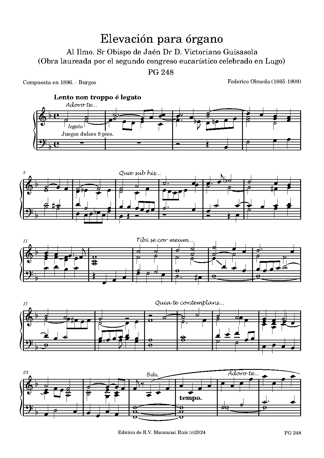 This work relates to number 248 according to catalog by Miguel Ángel Palacios Garoz (listed on "Federico Olmeda, un maestro de capilla atípico" by Miguel Ángel Palacios Garoz, 2003, ISBN 84-87876-90-0 pg 345). Edition takes as a base historical edition "Obras religiosas para órgano" from Federico Olmeda (ca. 1897), from the "Archivo de la Diputación de Burgos - Fondo Olmeda", box 8, kindly provided by the Archive and by Mr. Rodrigo CALZADA, and from "Federico Olmeda, un maestro de capilla atípico" by Miguel Ángel Palacios Garoz, 2003, ISBN 84-87876-90-0 pg 308 and 209. WARNING: This edition is meant to be used by amateurs, not by professionals. It is NOT a professional edition.