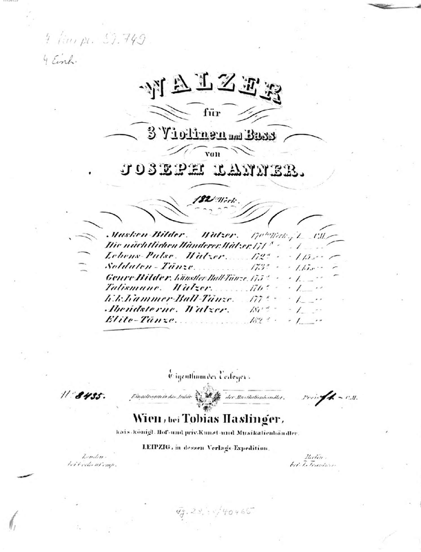 | Extra Information | According to Grove Music, all of Lanner's works "were published in Vienna for solo piano; most works also appeared simultaneously in arrangements for orchestra, piano for 4 hands, violin and piano, 3 violins and double bass and for solo flute". |
