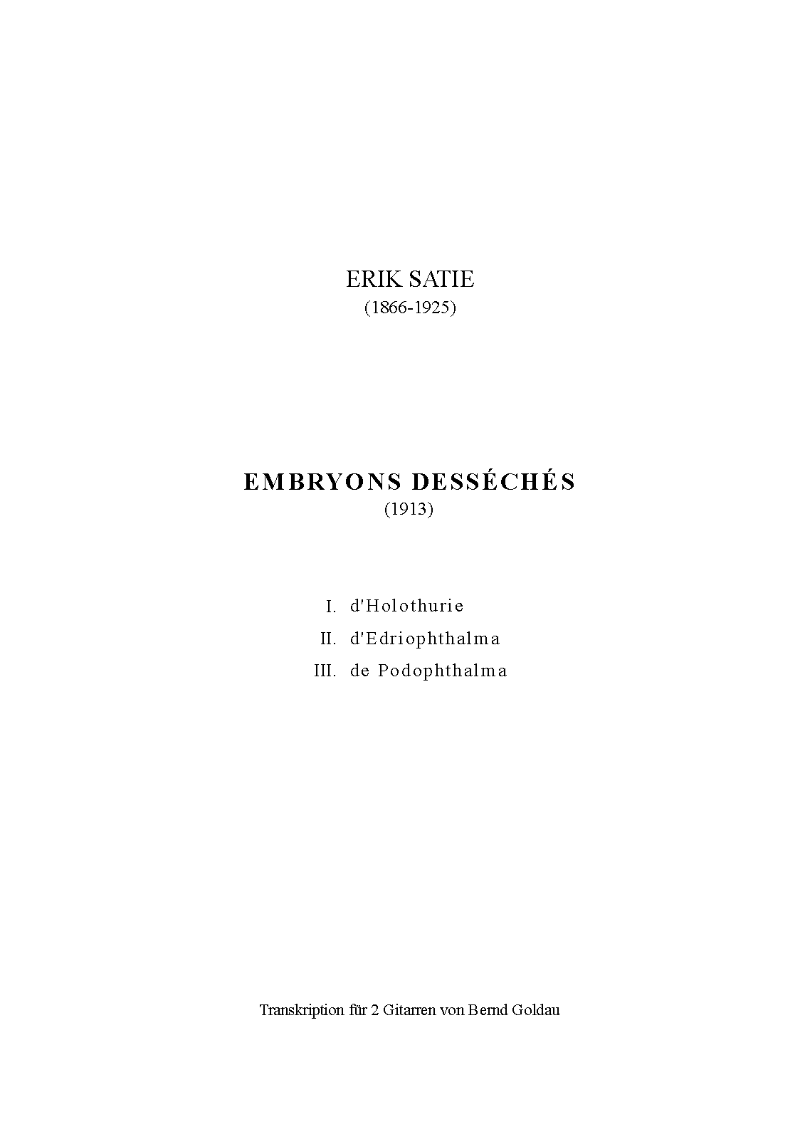 | Extra Information | Satie's text indication "Un conseilleur" in the third piece (de Podophthalma) coincides with a short quote from the "Chanson de Orang-Outang" from the 1880 operetta La mascotte by Edmond Audran. |