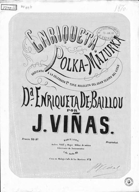 | Dedication | A la celebrada 1ª tiple absoluta del Gran Teatro del Liceo, Dª Enriqueta De Baillou |