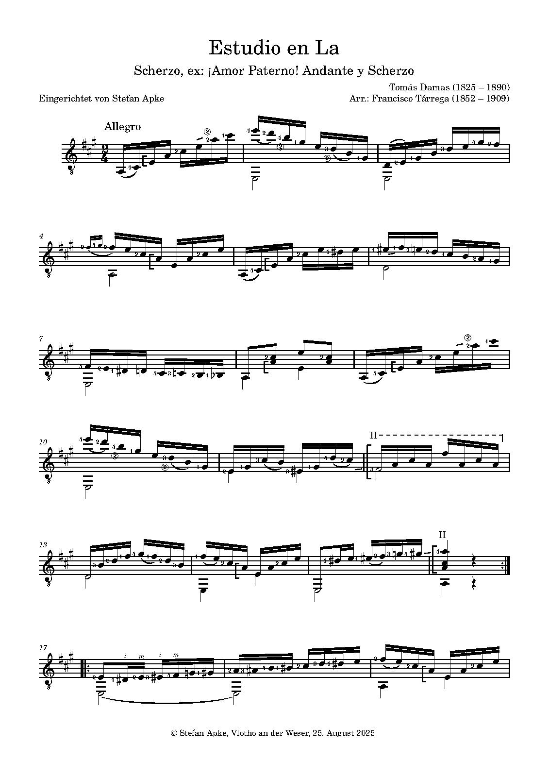 | Extra Information | Estudio para guitarra por Francisco Tárrega as mentioned in the manuscripts from Miguel Llobet or Estudio en La from Tárrega in the Ildedonso Alier editions is surely not from Tárrega. He used a shortened form of the Scherzo from ¡Amor Paterno! Andante y Scherzo with just a few changes and added his fingering. (Already Gangi / Carfagna: Tárrega. Opere per Chitarra, Bèrben, Vol.2 - Studi, mentioned this item as being a Studio - Scherzo (Da T. Damas).) |