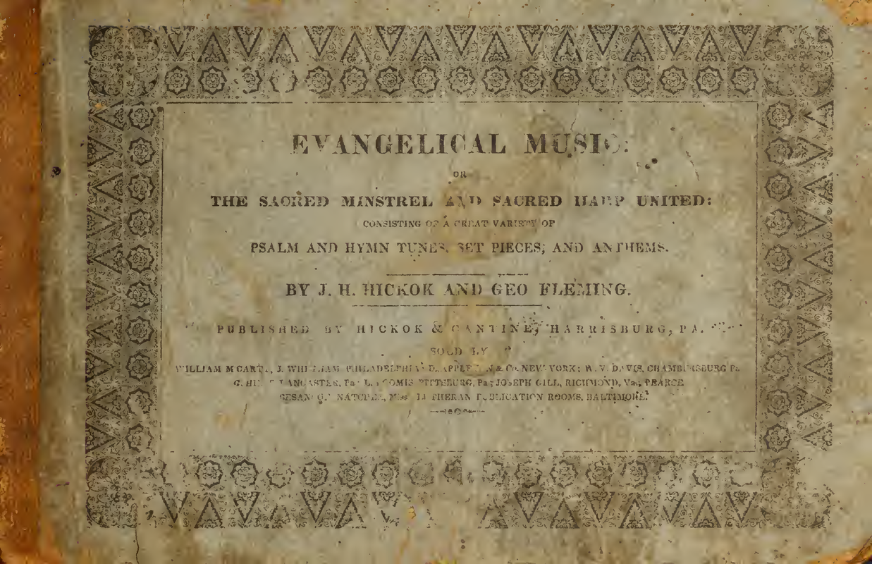 Evangelical Musick; or, The Sacred Minstrel and Sacred Harp United: consisting of a great variety of Psalm and Hymn Tunes, Set Pieces, Anthems, &c., by J.H. Hickok and Geo. Fleming.