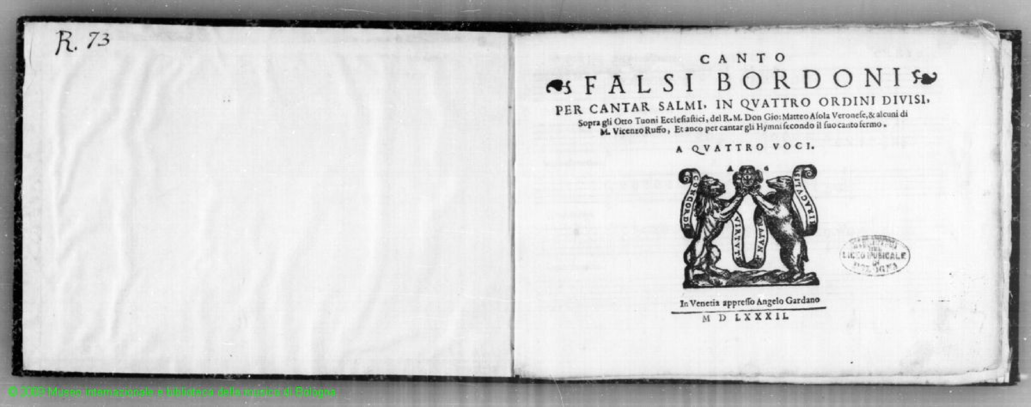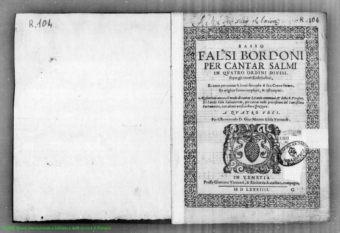 | Alternative. Title | Falsi Bordoni per cantar Salmi, in quatro ordini divisi, sopra gli Otto Tuoni Ecclesiastici del R. M. Don Gio: Matteo Asola Veronese, & alcuni di M. Vincenzo Ruffo. Et anco per cantar gli Hymni secondo il suo canto fermo. A Quatro voci. - In Venetia Appresso li Figliuoli di Antonio Gardano 1575. |