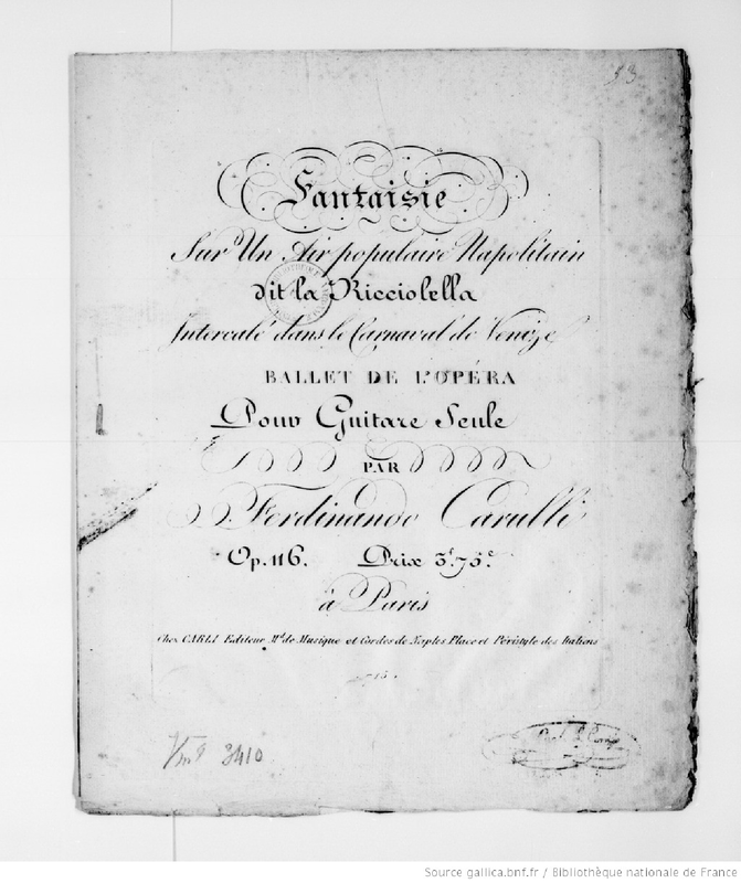 | Alternative. Title | Fantaisie sur un air populaire Napolitain, dit la Ricciolella, intercale dans le Carnaval de Venize, ballet de l'opéra, pour Guitare seule |