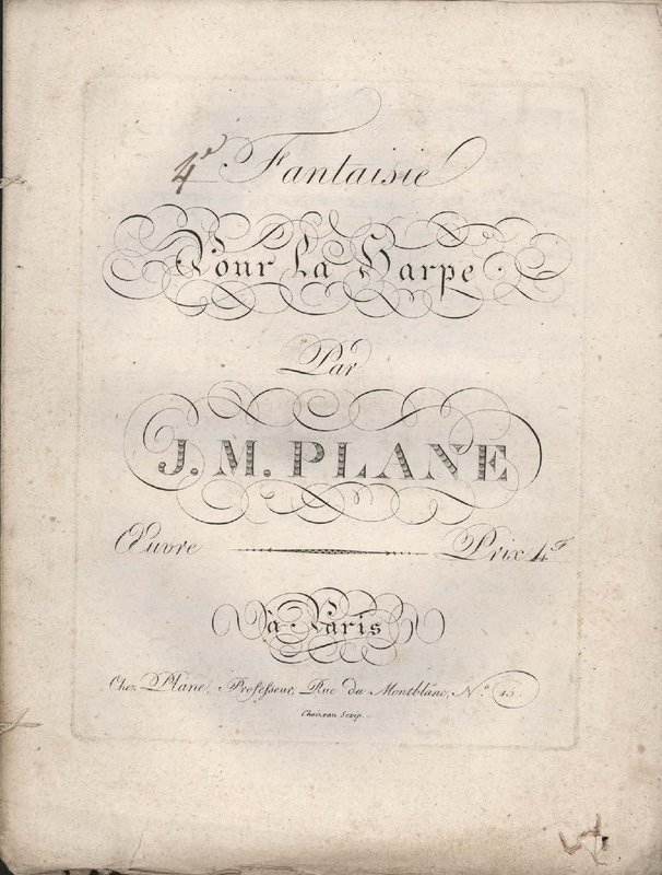 Same observations as for Plane's Sonata 1 except here we have a Harp solo work inscribed on the Title Page, but the score indicates the addition of a Horn. From the other works by the same composer, it may be an ad lib Horn part. The composer who was his own editor, must have printed many copies of the same page which were not always adapted to what followed. This time the composer cum editor's logo has not been relabelled.