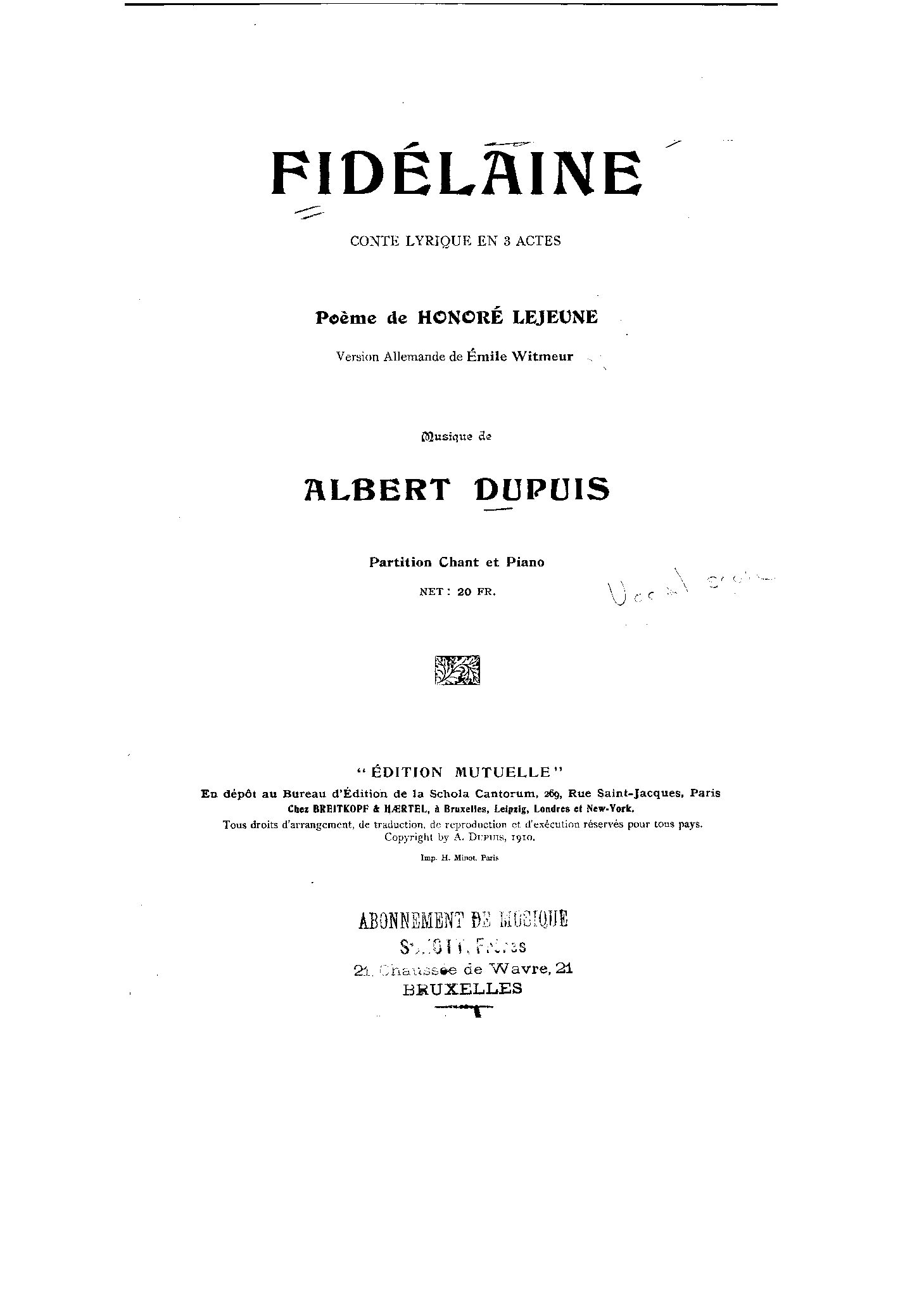 | Extra Information | The libretto of act 3 was published in the December 1909 issue of "Belgique artistique et littéraire: revue nationale du mouvement..." According to the 30 August-6 September 1908 Guide musical, was cowinner of an Ostend opera prize. |