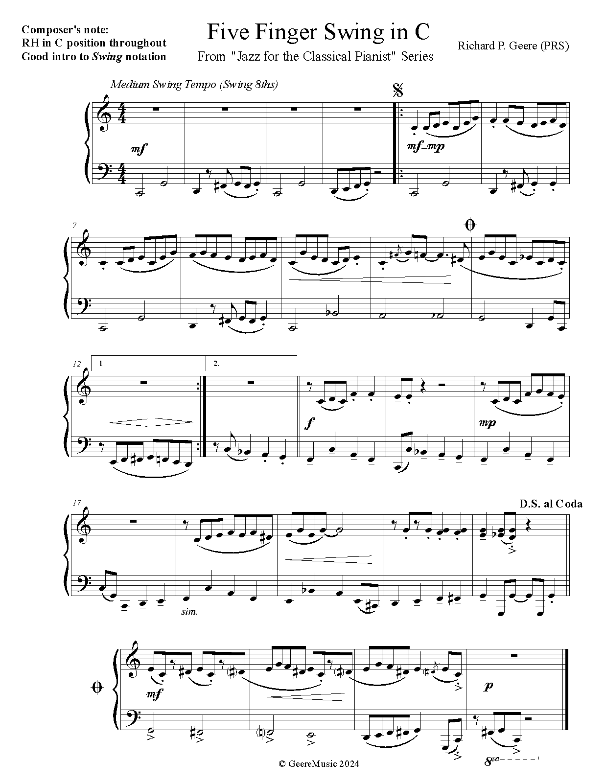 | Extra Information | Right hand stays in 5 finger C position. Good intro to swing notation. Good study for basic "Swing"notation and articulation. Also useful for teaching first/secong ending with a D.S. al Coda. |