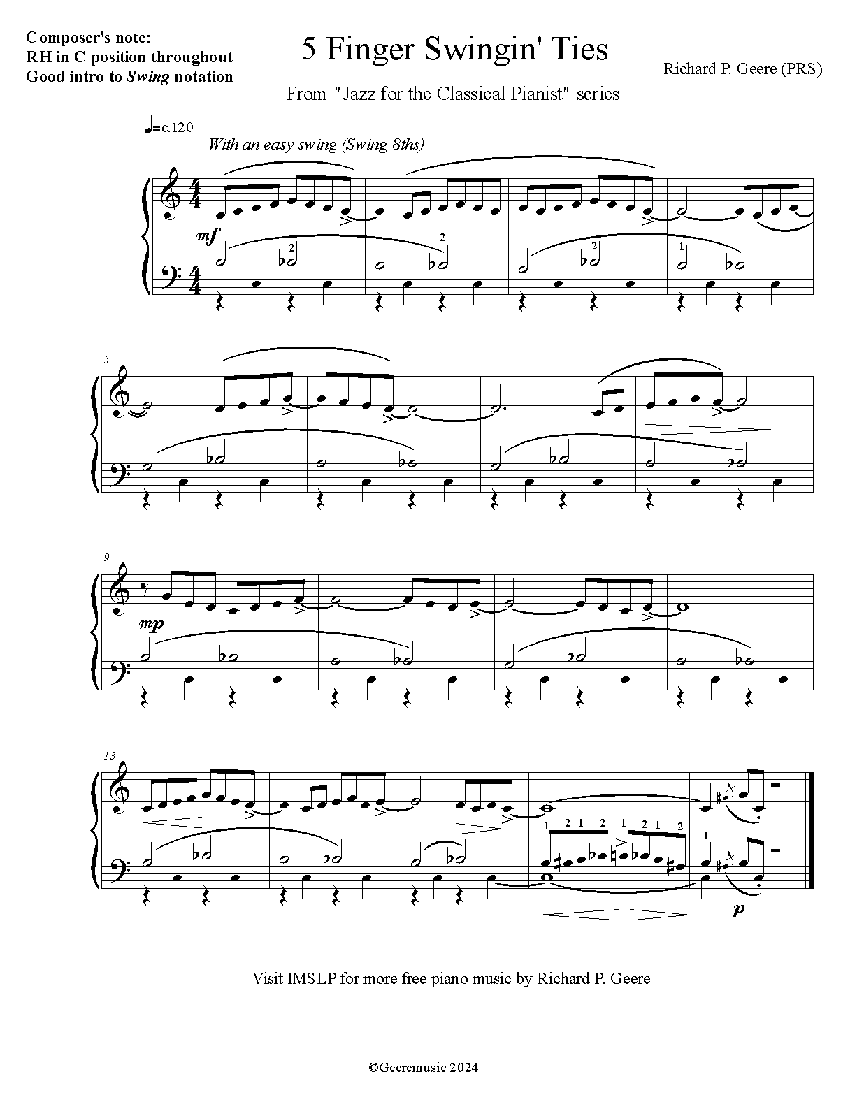 | Extra Information | Good study of "Swing" notation. Includes ties and accents. Right hand in 5 finger "C" position throughout. Useful for studying ties across beats/measures in a "Swing" style. |