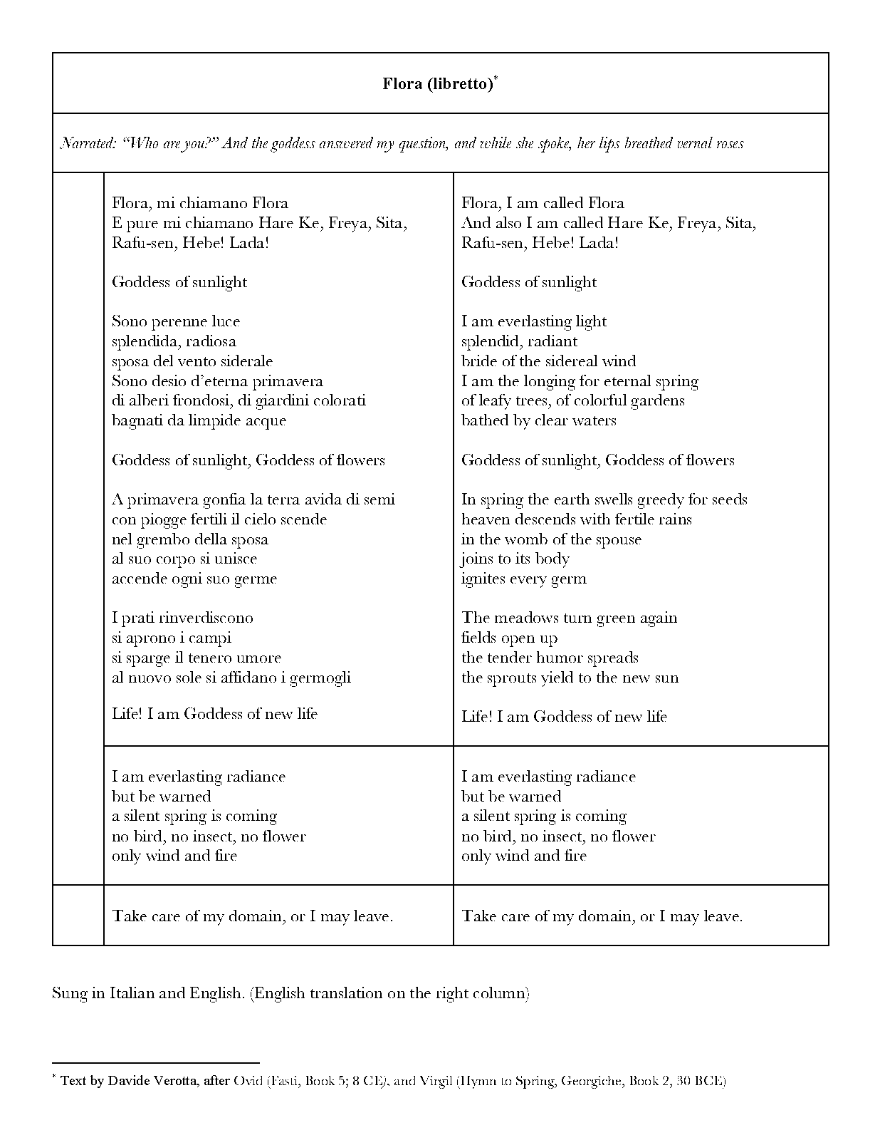 | Extra Information | A soft-spoken warning about global warming and the perils associated with the Anthropocene, Flora is inspired by two ancient texts about the goddess of spring. The first, by Ovid (Fasti, Book 5; written 8 C.E.), describes the origin and powers of Flora, and the second, a poem by Virgil (Hymn to Spring, Georgiche, Book 2; published 30 B.C.E.) celebrates the season of rebirth. In the narrative of the piece, the goddess appears in physical form to the poet, answers his question about her nature and powers, and warns about the silent spring that might be coming. Then, symbolized by a final instrumental section, the apparition disappears. |
