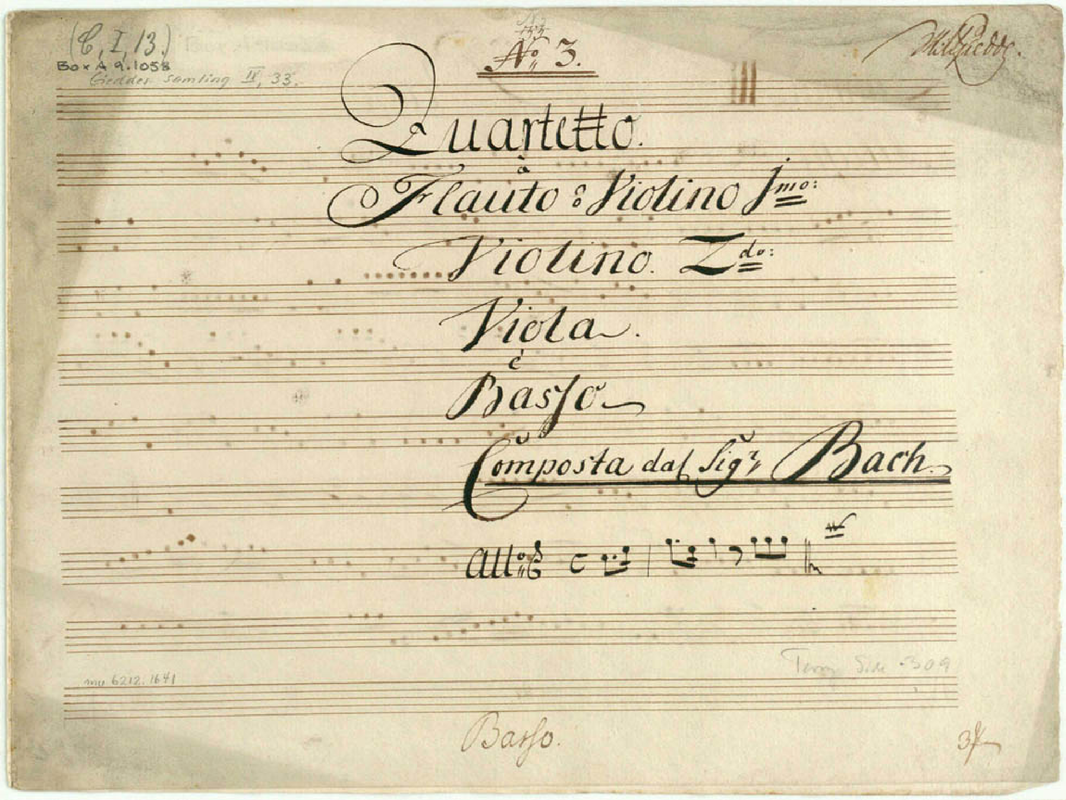 Extra Information "Basso" part contains T.S. (tasto solo) indications, which means that the passage should be played without realised harmony. Implies the use of continuo in this work. A claimed first edition of this work was published by Musica Rara in 1961 with Stanley Sadie as editor (Plate M.R.1068). In his introduction (1962) the latter declares he based his edition on the original one in the British Museum (press-mark, g.435.(2.)). The original edition has a figured bass part, probably not the work of J.C.Bach. Apart from obvious corrections, S.Sadie's edition adds phrasings in lighter type. This quartet was the third of a series published under the title Six Quartettos for a German Flute, Violin, Tenor and Bass or Two Violins, a Tenor and a Bass, by Messrs. Bach, Abel and Giardini. J.C.Bach wrote nos.1, 3 and 5 of this set. Abel contributed nos.2 and 4, Felice Giardini, no.6.