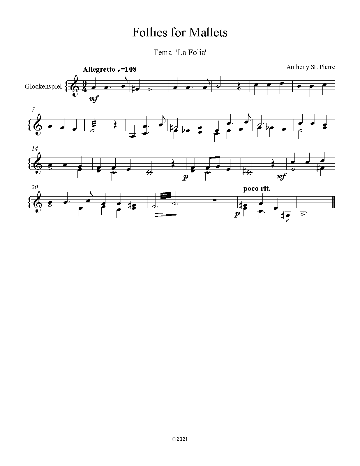 | Extra Information | Six variations on 'La Folia' for solo mallet percussion |