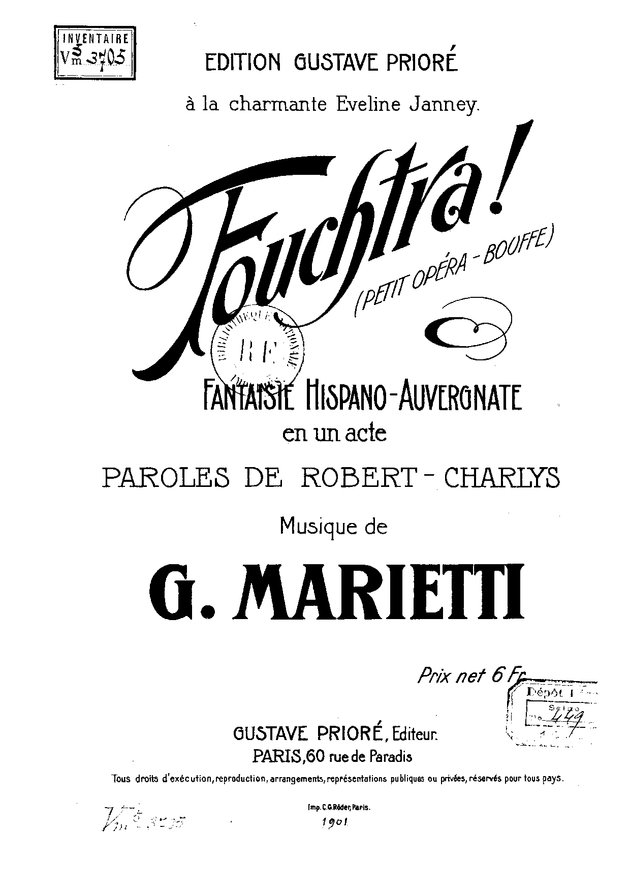 | Copyright Information | Publication noted in the Bibliographie de la France : 90e année, 2e série, Nº 6, 9 Février 1901, p.106, reg.909 (vocal score). |