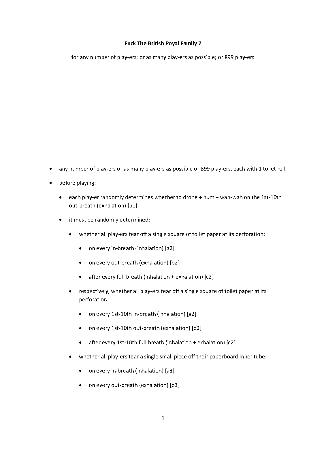 | Instrumentation | any number of play-ers or as many play-ers as possible or 899 play-ers, each with 1 toilet roll |