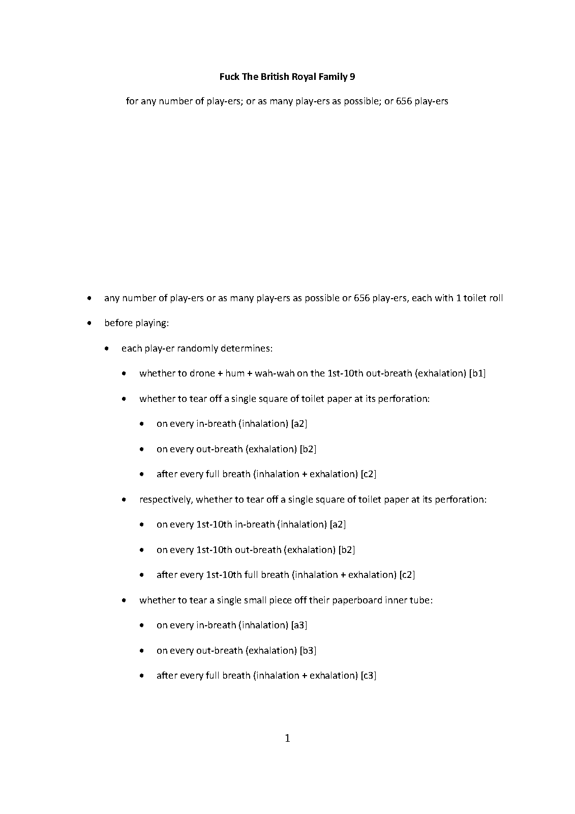 | Instrumentation | any number of play-ers or as many play-ers as possible or 656 play-ers, each with 1 toilet roll |