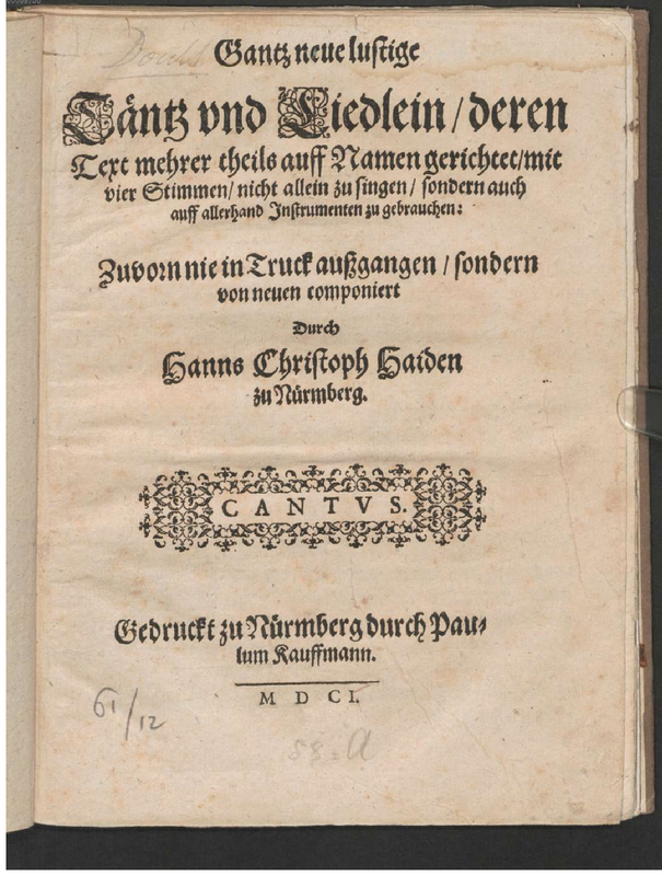 | Alternative. Title | Gantz neue lustige Täntz vnd Liedlein, deren Text mehrer theils auff Namen gerichtet, mit vier Stimmen, nicht allein zu singen, sondern auch auff allerhand Instrumenten zu gebrauchen |