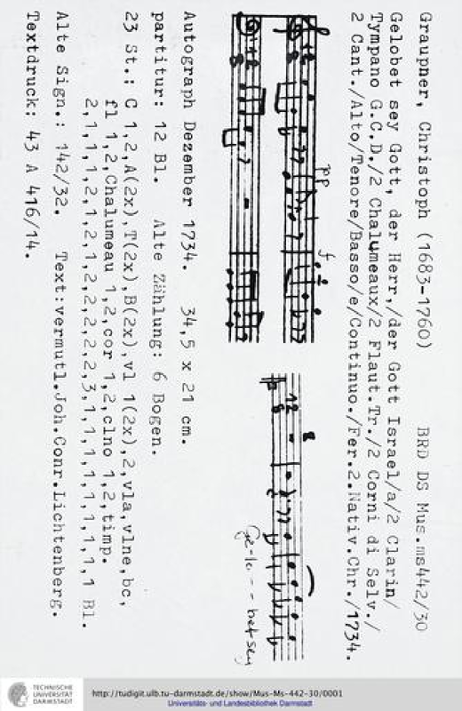 | Instrumentation | SSATB, 2 flutes, 2 chalumeaux, 2 horns, 2 trumpets, timpani, strings, continuo |