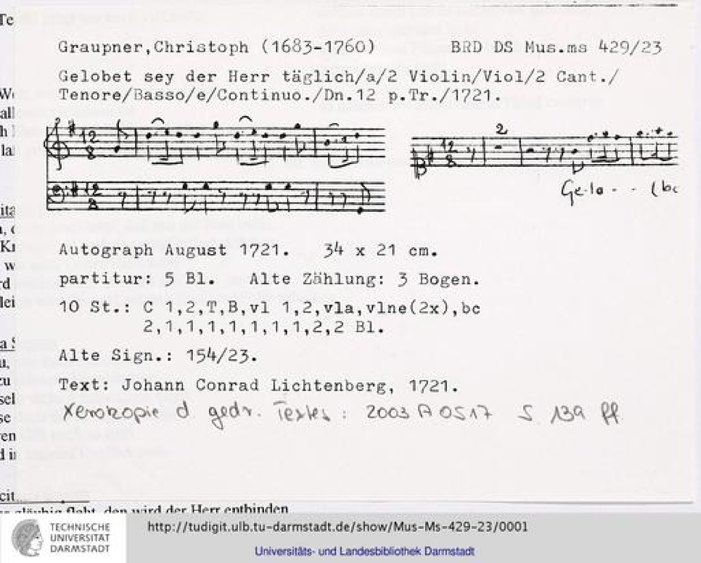 | Work Title | Gelobet sei der Herr täglich, GWV 1153/21 |