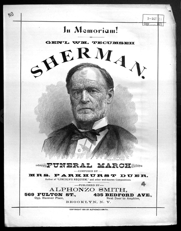 General William T. Sherman's Funeral March ; In Memoriam! Gen'l Wm. Tecumseh Sherman. Funeral March composed by Mrs. Parkhurst Duer.
