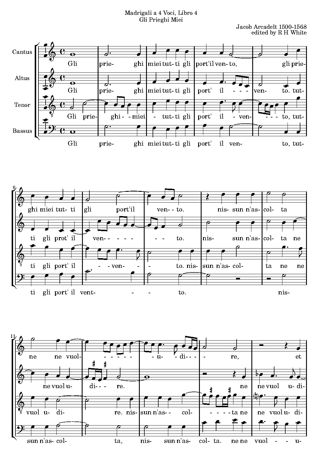 This is the first Madrigal in the collection "Il Quarto Libro Di Madrigali D'Archadelt a Quatro Voci" published by Antonio Gardane (Gardano), Venice (1539)
