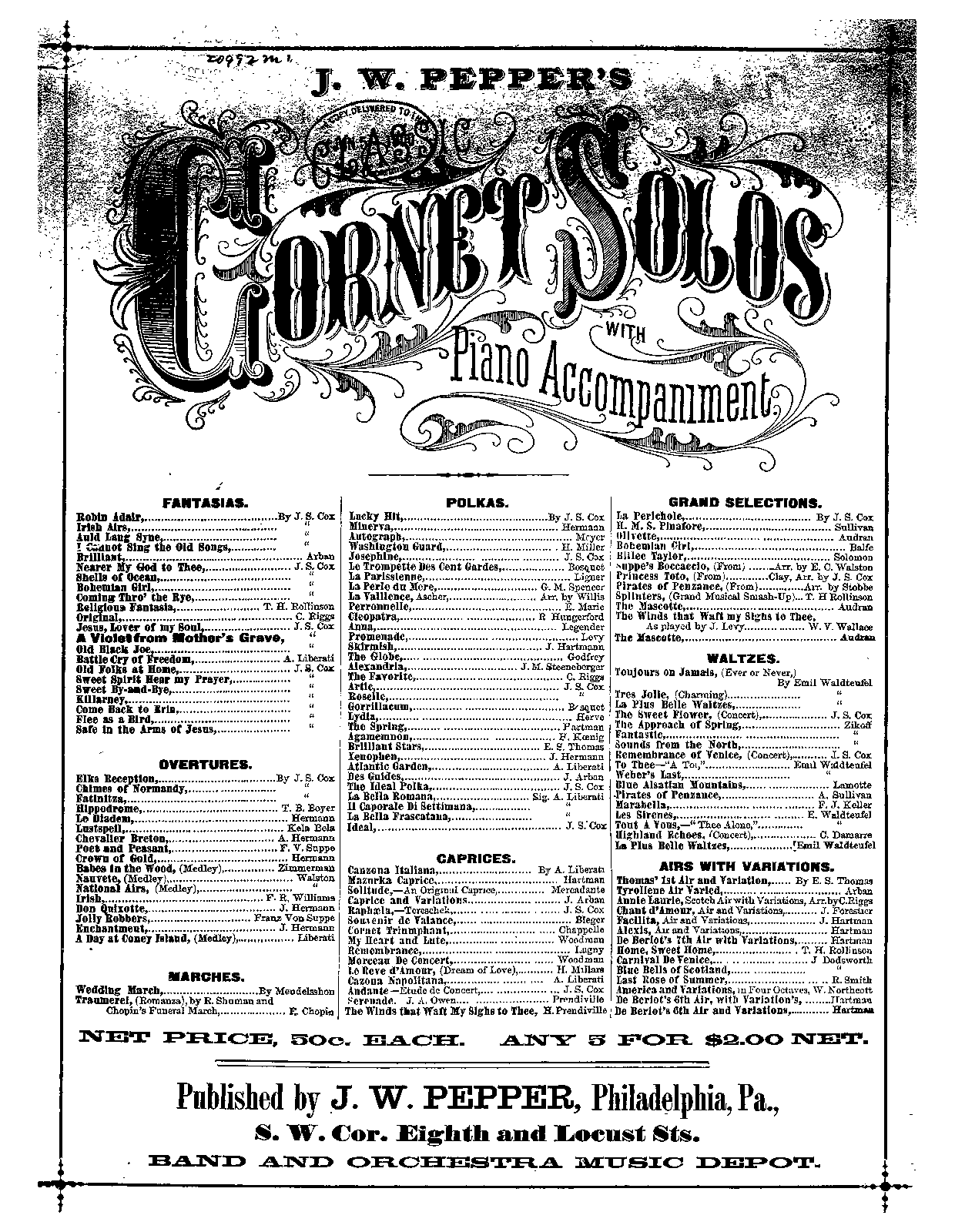 Issued by J.W. Pepper as number 120 in their Theatrical and Dance Journal series the work could be performed by an orchestra consisting of first and second violins, viola, bass, flute, clarinet, first and second cornets, trombone, and piano. For a larger orchestra parts were made available for cello, a second clarinet, first and second horns, and large and small drums.