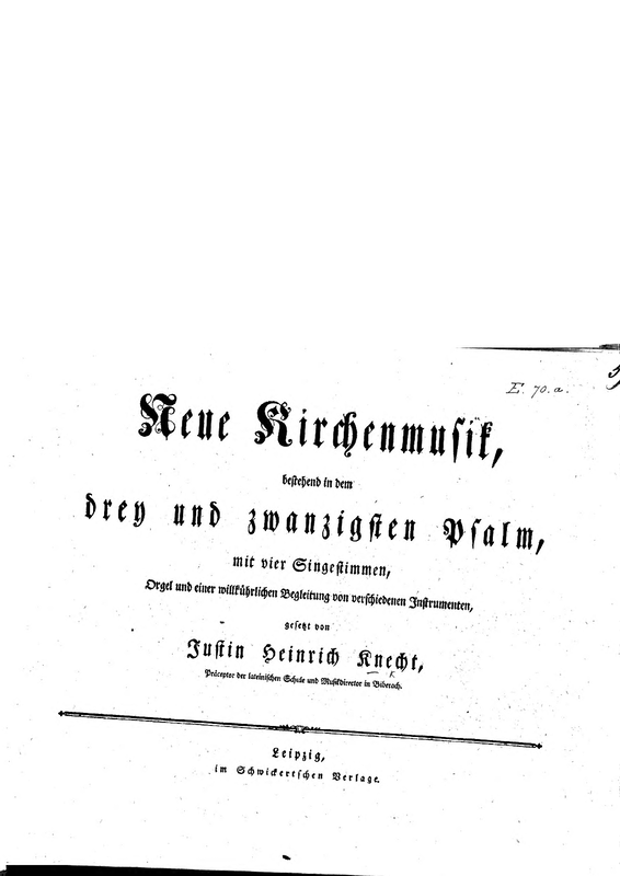 | Alternative. Title | Neue Kirchenmusik, bestehend in dem drey und zwanzigsten Psalm, mit vier Singestimmen, Orgel und einer willkührlichen Begleitung von verschiedenen Instrumenten |
