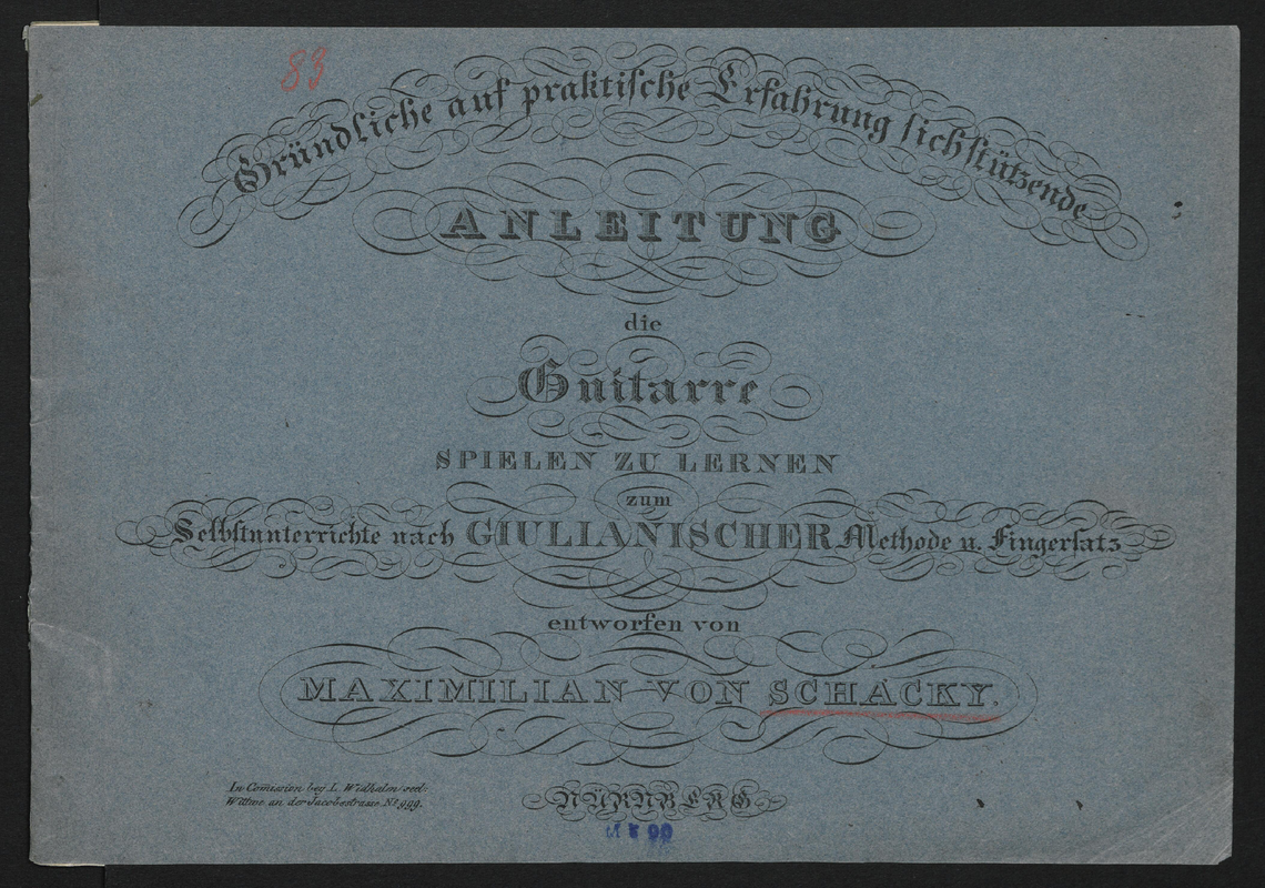 | Alternative. Title | Gründliche auf praktische Erfahrung sich stützende Anleitung die Guitarre spielen zu lernen zum Selbstunterricht nach Giulianischer Methode u. Fingersatz entworfen von Maximilian von Schacky. |