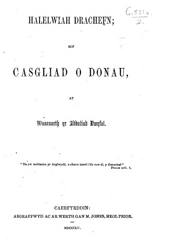 Includes several "old-fashioned" fugue-type tunes (some American) and a number of minor-key tunes. Modern Welsh spelling is Haleliwia