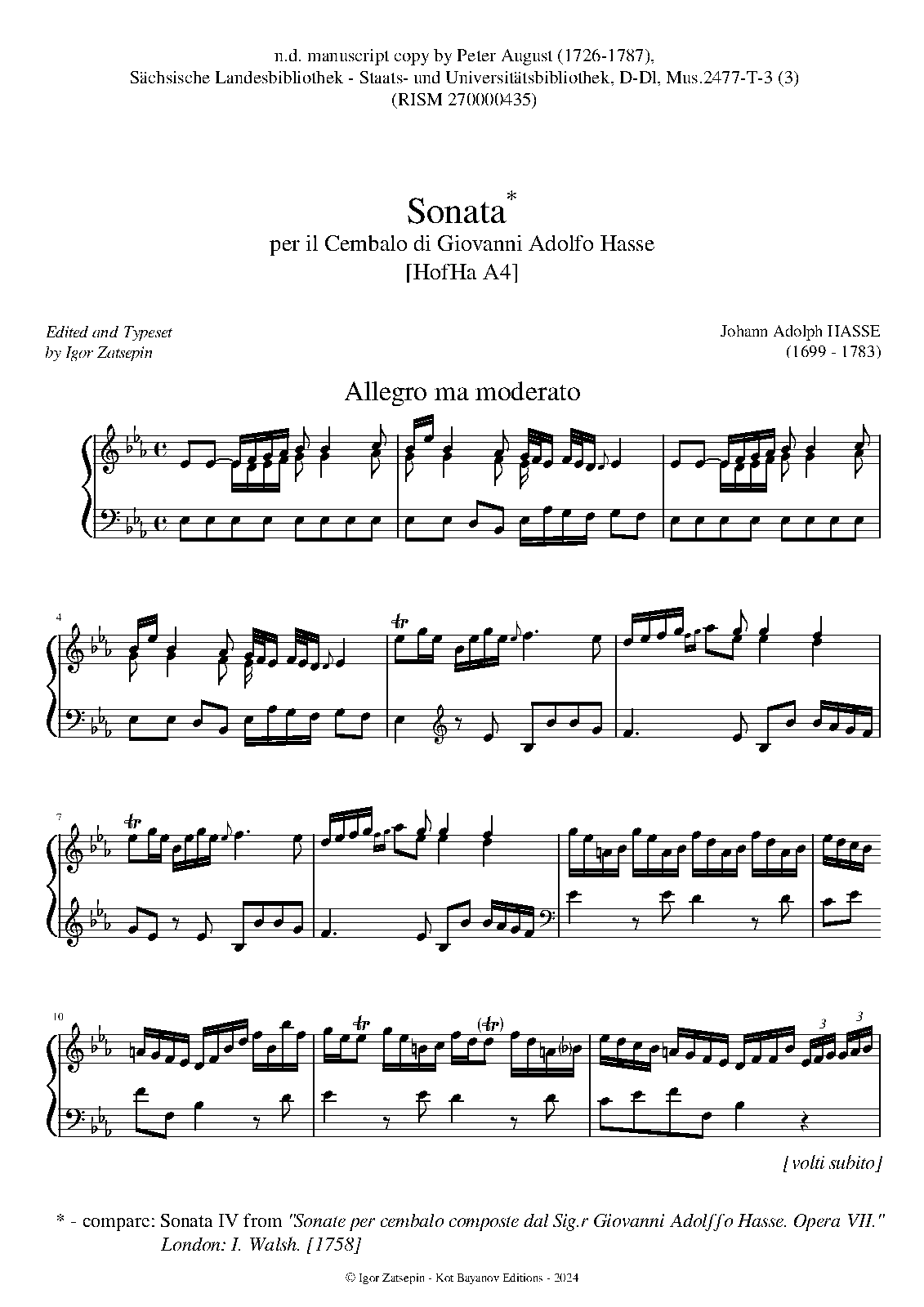 | Extra Information | variant of Sonata IV from "Sonate per cembalo composte dal Sig.r Giovanni Adolffo Hasse. Opera VII.",London: I. Walsh. 1758 |