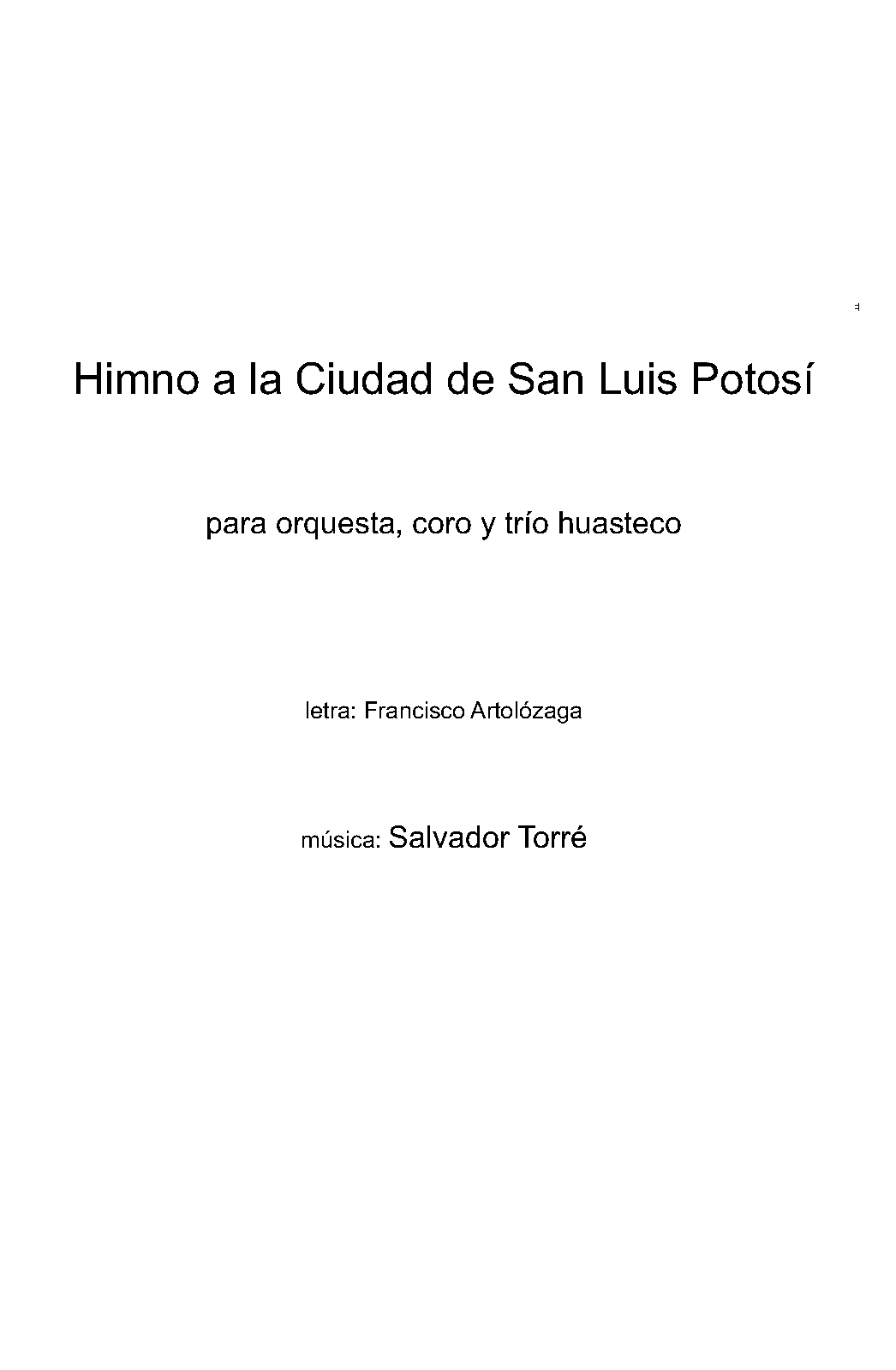 My Birthplace San Luis Potosí (S.L.P.) made a public call for proposals in 2008 to compose the anthem of the City, I chose the most typical of the region, the Huasteca music, very cheerful folk music of the region full of dynamism where texts are improvised at the time which is being performed. The text of Francisco Artolozaga was imposed by the competition and I wrote it considering the classic elements of an anthem for Choir, Symphony Orchestra and Huastec folk trio. I didn't win the contest but for me it was an excellent occasion to make a musical tribute to my hometown. ...
