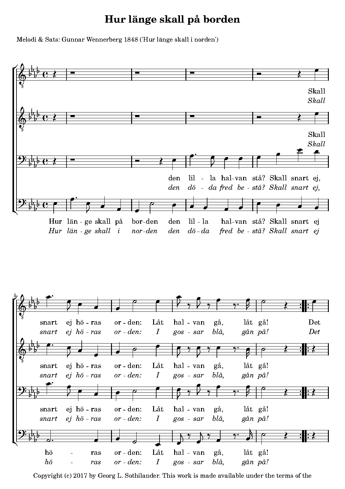 The original text is "Hur länge skall i norden den döda frid bestå?". A new text has been written to use the music as a drinking song.