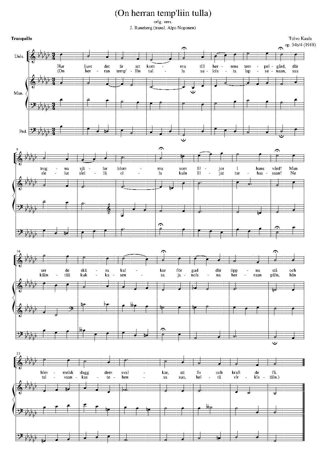 Like Aftonbön this psalm was submitted to the competition sponsored by Suomen Lähetysseura. It has also always been sung by mixed choirs although not intended for that ensemble, due to 1st publication in an anonymous mixed chorus arrangement, transposed from the original (to F major in this case).