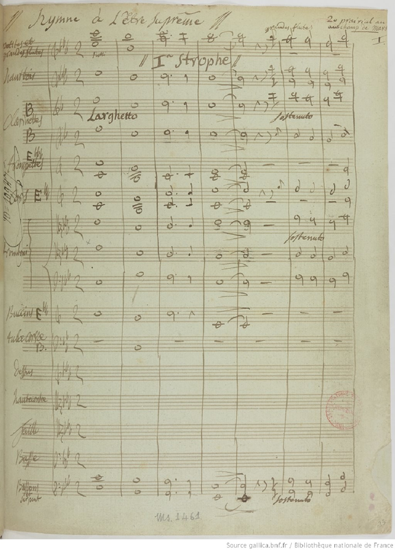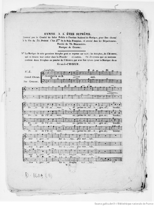| Extra Information | Gossec initially composed for the text by Marie-Joseph Chénier (RH 629a), but eventually the new text by Désorgues was adopted. For details, see Constant Pierre, Les hymnes et chansons de la Révolution, pp. 308-20. Hymne à l'être suprême, RH 629b, also written for the Feast of the Supreme Being on 8 June 1794, is based on the same text. |