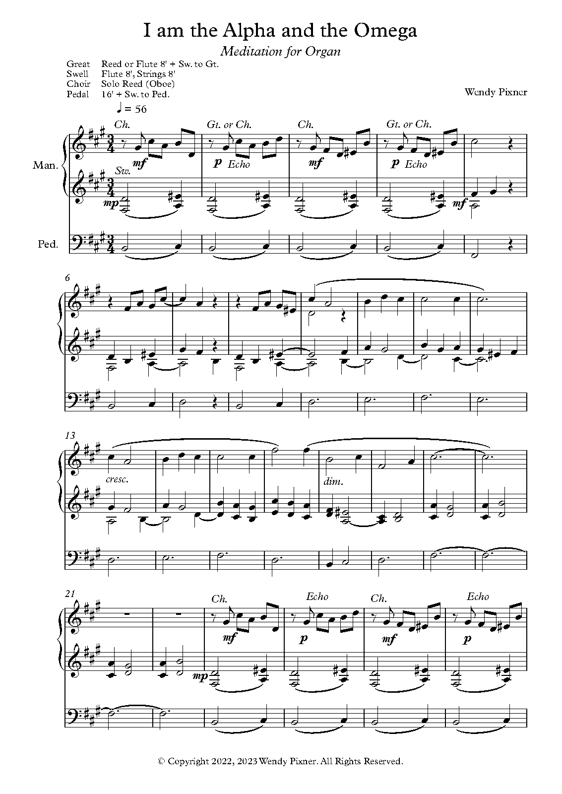 | Extra Information | An organ prelude or interlude evoking the text of Revelation 22:13: 'I am the Alpha and the Omega, the First and the Last, the Beginning and the End' |