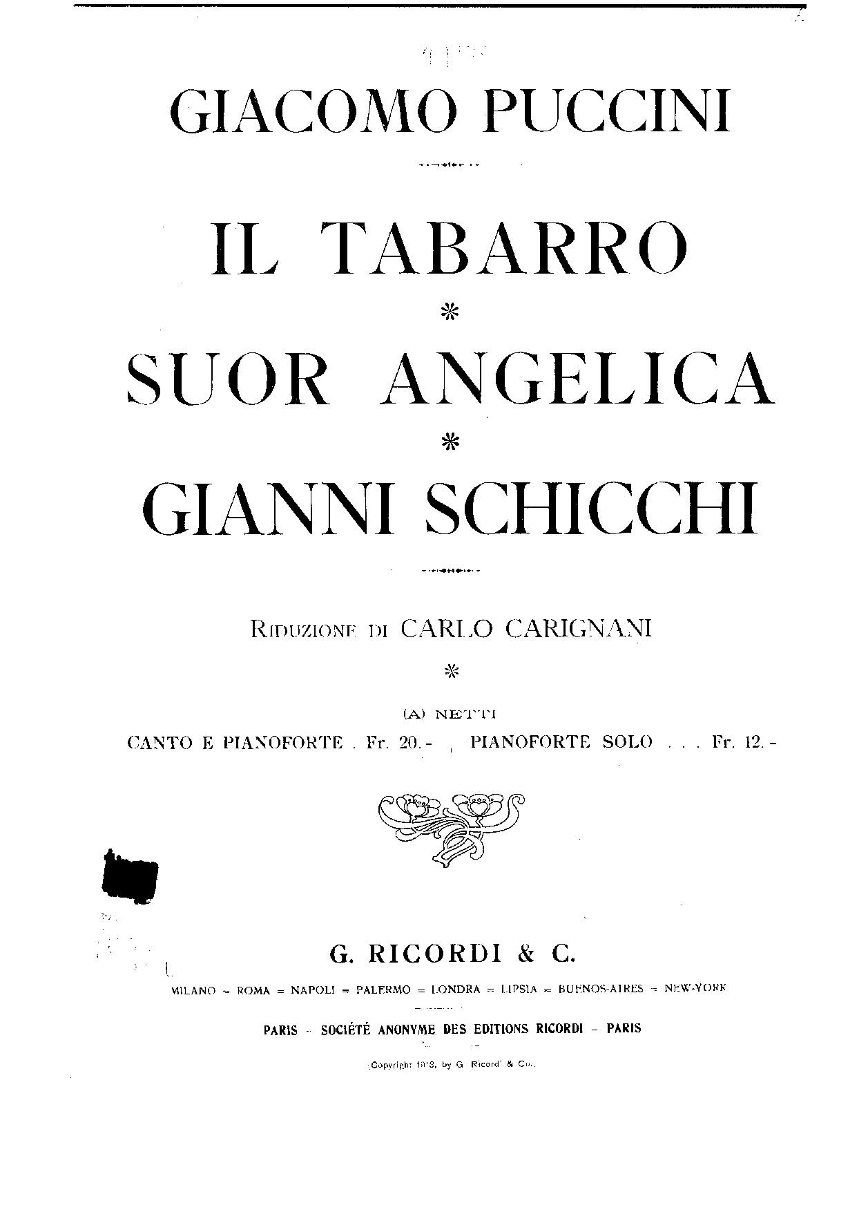 | Librettist | Giuseppe Adami (1878-1946) Il tabarro Giovacchino Forzano (1884-1970) Suor Angelica, Gianni Schicchi |